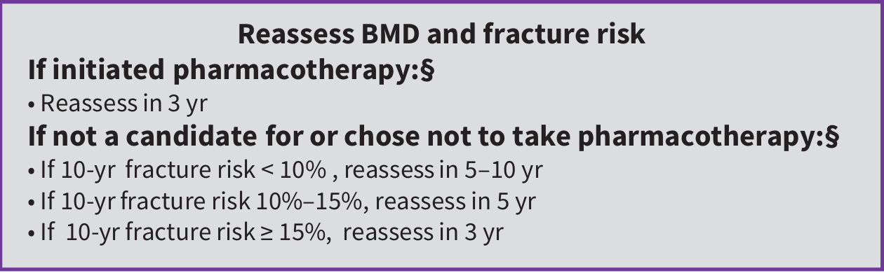 Of note, the 2023 Osteoporosis Canada Guideline addresses postmenopausal females and males aged 50 years or older, and does not apply to those who are younger, including children with secondary osteoporosis and fractures. Due to their rate of bone growth, a repeat BMD earlier than 3 years may be beneficial.